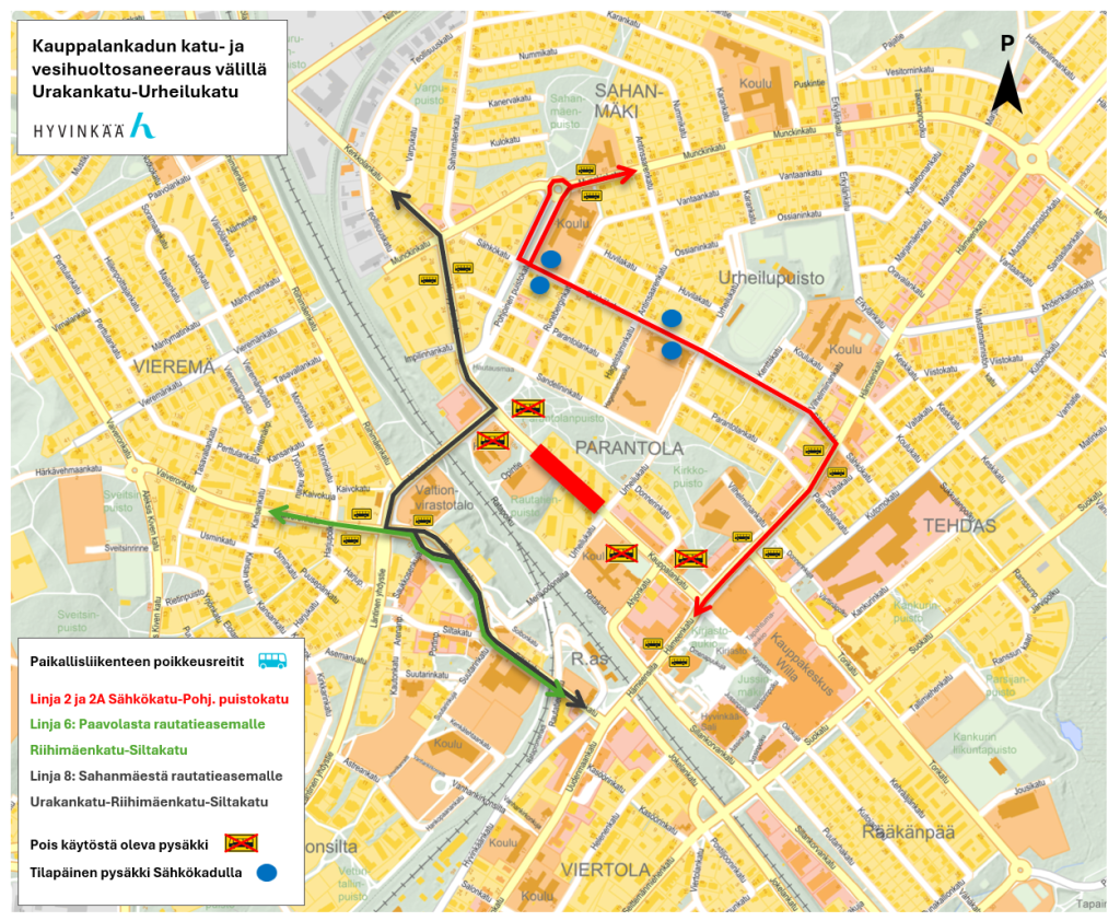 - Läpiajoliikenne Kauppalankadulla sulkeutuu ma 30.3.2026 alkaen. Poikkeusreitti linjoilla 2, 2A, 6 ja 8.